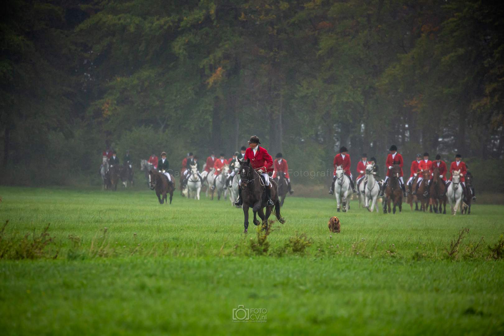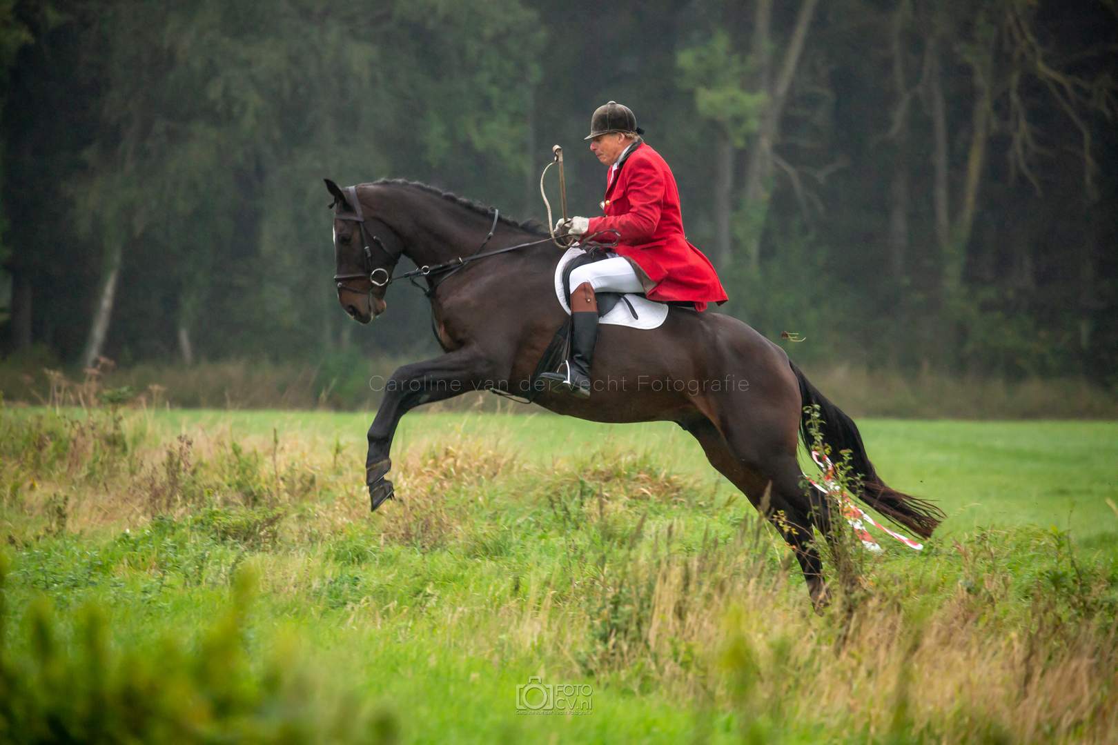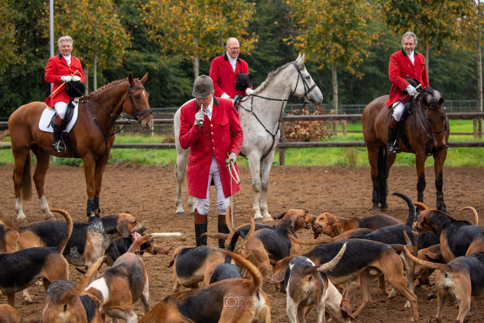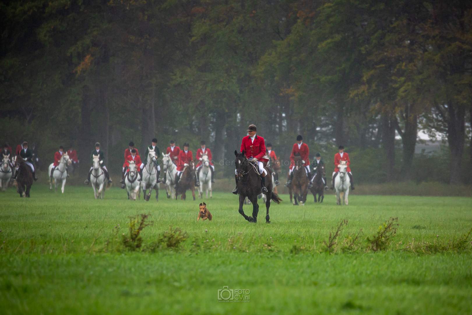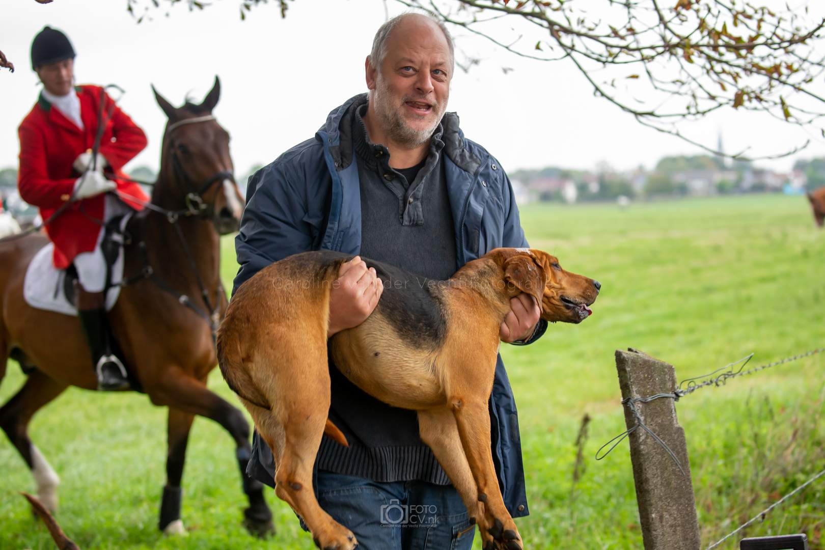 Een typische jachtdag, met miezerregen (af en toe wat harder), weiland, slootjes, boomstammen, de honden etc. Alleen zonder stirrup en zonder afterhunt. Toch wel raar zo.