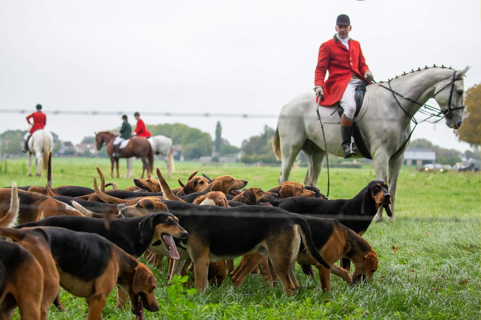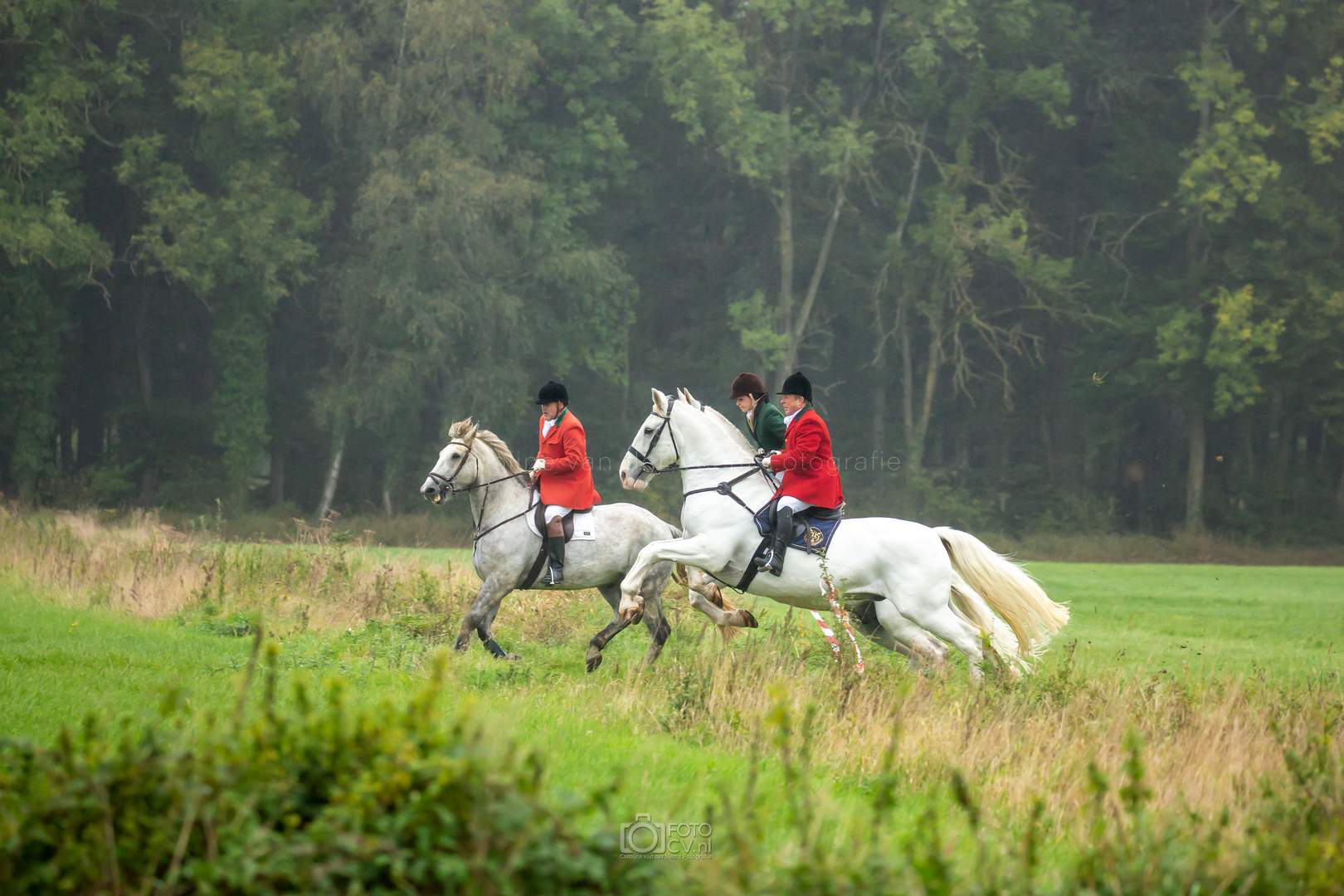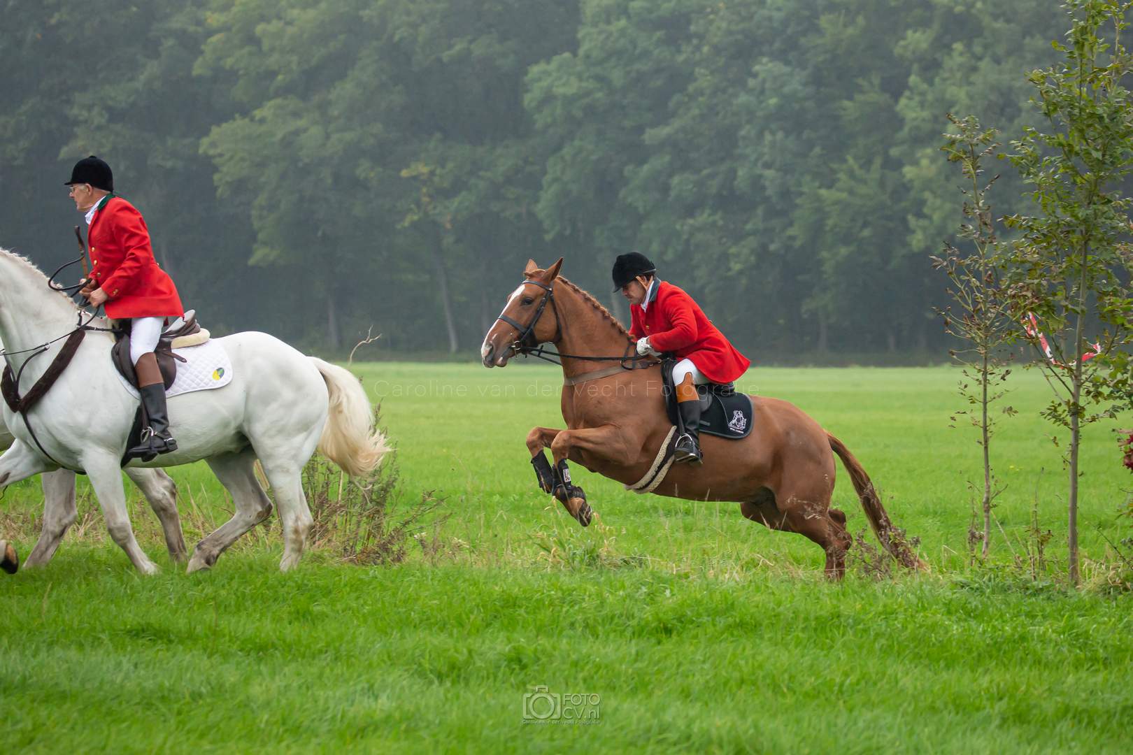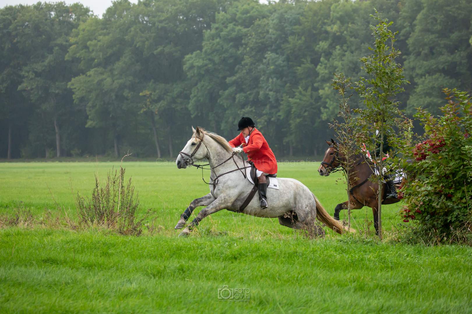 Een typische jachtdag, met miezerregen (af en toe wat harder), weiland, slootjes, boomstammen, de honden etc. Alleen zonder stirrup en zonder afterhunt. Toch wel raar zo.
