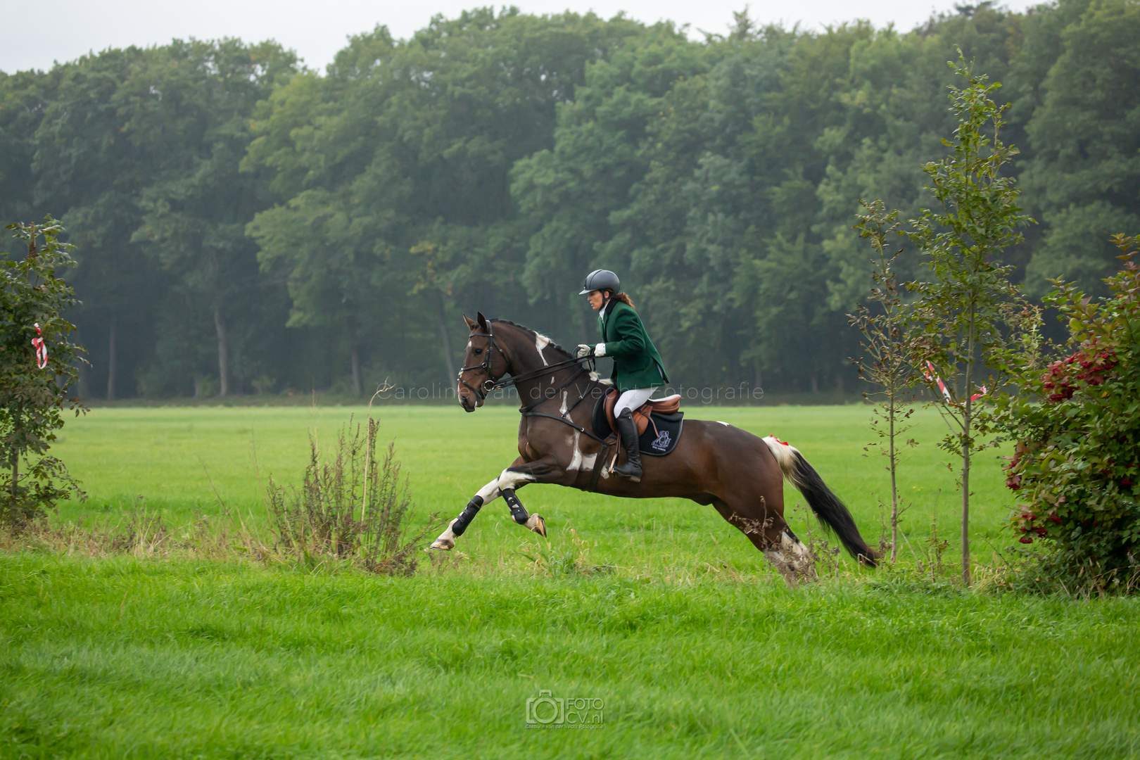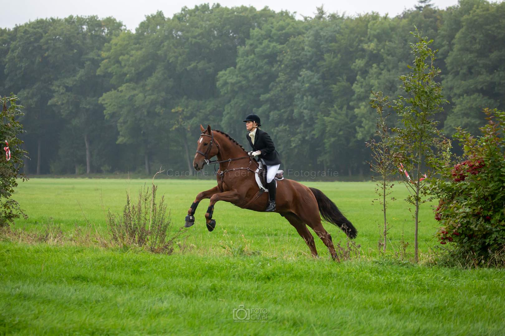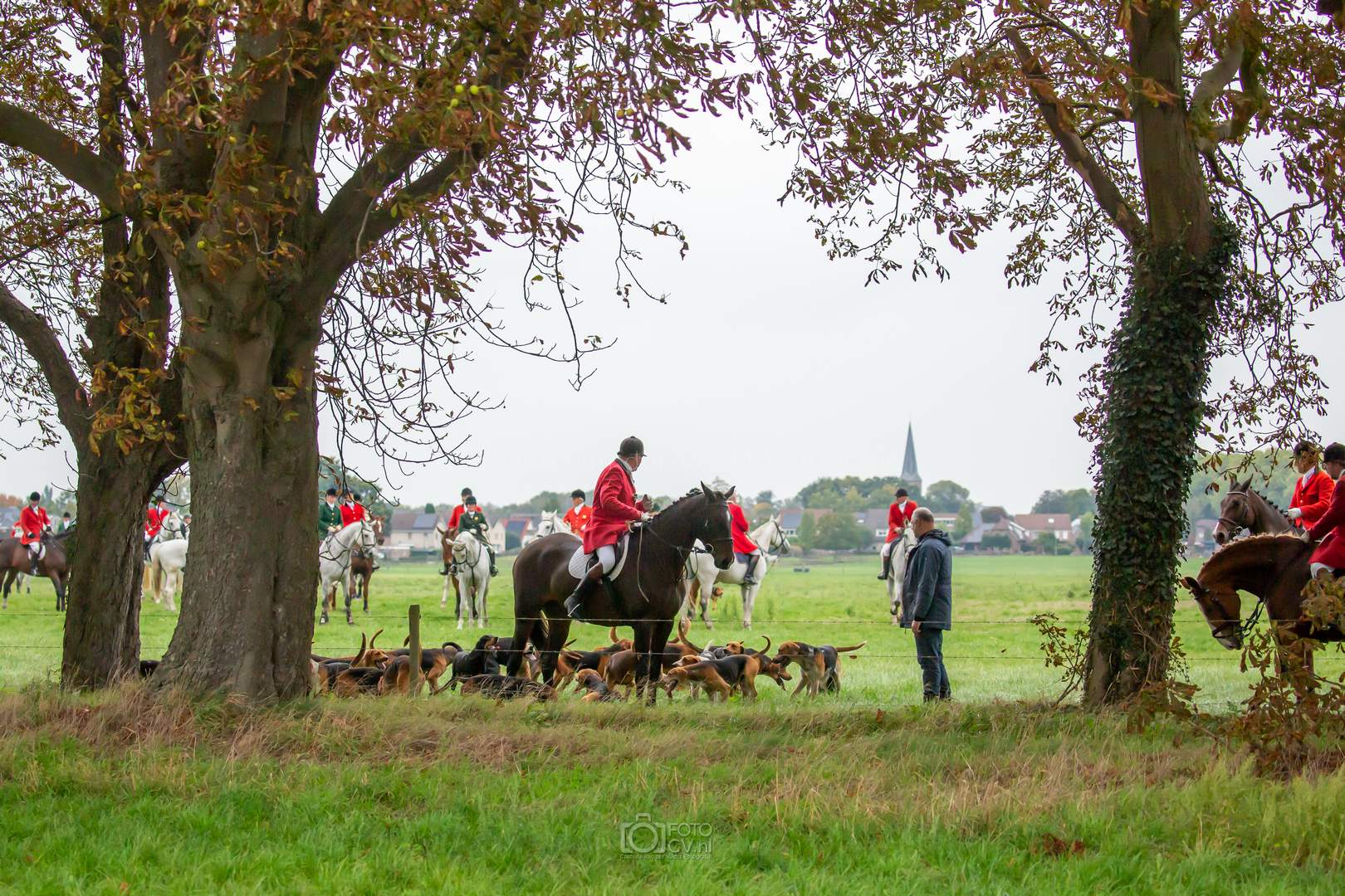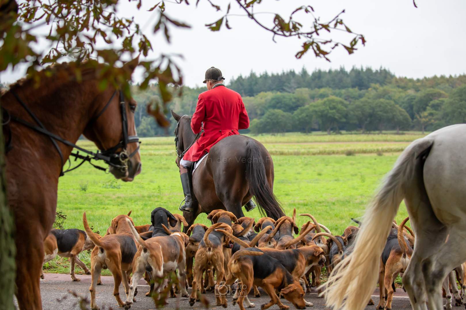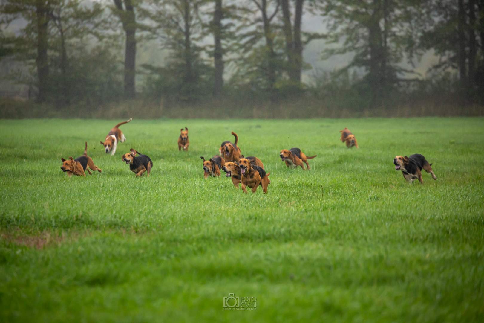 Een typische jachtdag, met miezerregen (af en toe wat harder), weiland, slootjes, boomstammen, de honden etc. Alleen zonder stirrup en zonder afterhunt. Toch wel raar zo.