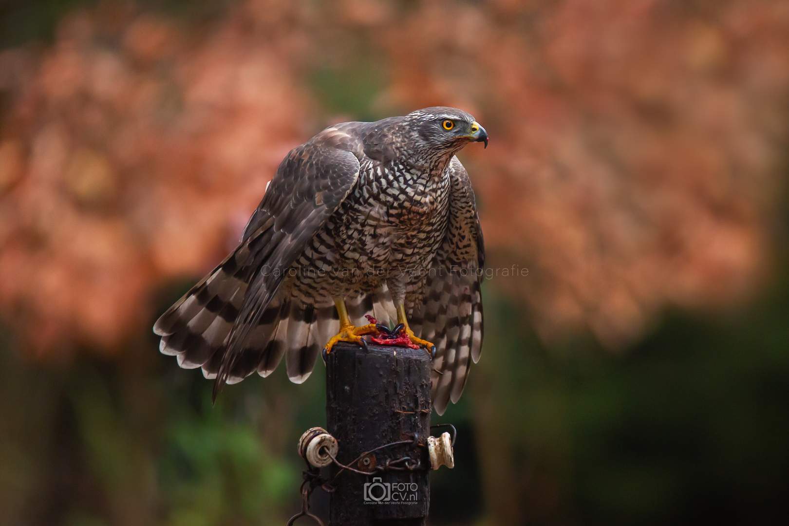 Vandaag was het thema ‘rood’. Door de prachtige achtergrond bij deze fotohut komen de kleuren prachtig uit. De ogen van de havik, het roodborstje, de eekhoorn, allemaal pastte ze perfect in het decor en lieten zich mooi vastleggen. Het meest blij ben ik met de portretten van de havik, wat een fotogenieke vogel!